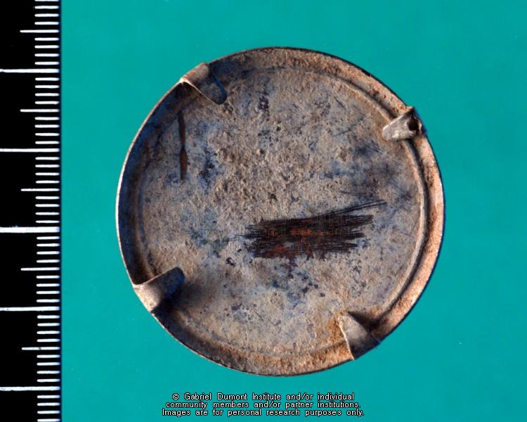 This image (by Peter Beszterda) is of a cap or lid. It was collected by Dennis and Jean Fisher and their sons in the late 1960s or early 1970s from Batoche. It is part of the Dennis and Jean Fisher Collection. This collection contains archaeological artifacts taken from the battlefields of the 1885 Resistance as well as Fort Pitt (Saskatchewan), Cumberland House (Saskatchewan) and St. Peter’s Mission, Montana. The collection also includes various artifacts and ephemera relating to the 1885 Resistance and Gabriel Dumont. |