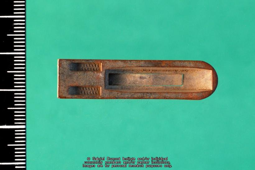 This image (by Peter Beszterda) is of a concertina reed. It was collected by Dennis and Jean Fisher and their sons in the late 1960s or early 1970s from Batoche. It is part of the Dennis and Jean Fisher Collection. This collection contains archaeological artifacts taken from the battlefields of the 1885 Resistance as well as Fort Pitt (Saskatchewan), Cumberland House (Saskatchewan) and St. Peter’s Mission, Montana. The collection also includes various artifacts and ephemera relating to the 1885 Resistance and Gabriel Dumont. |