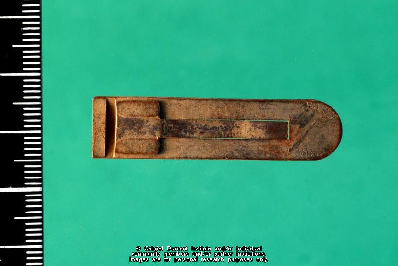 This image (by Peter Beszterda) is of a concertina reed. It was collected by Dennis and Jean Fisher and their sons in the late 1960s or early 1970s from Batoche. It is part of the Dennis and Jean Fisher Collection. This collection contains archaeological artifacts taken from the battlefields of the 1885 Resistance as well as Fort Pitt (Saskatchewan), Cumberland House (Saskatchewan) and St. Peter’s Mission, Montana. The collection also includes various artifacts and ephemera relating to the 1885 Resistance and Gabriel Dumont. |