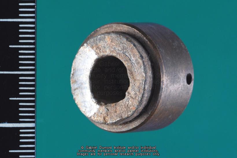 This image (by Peter Beszterda) is of an unknown brass and lead item. It was collected by Dennis and Jean Fisher and their sons in the late 1960s or early 1970s from Batoche. It is part of the Dennis and Jean Fisher Collection. This collection contains archaeological artifacts taken from the battlefields of the 1885 Resistance as well as Fort Pitt (Saskatchewan), Cumberland House (Saskatchewan) and St. Peter’s Mission, Montana. The collection also includes various artifacts and ephemera relating to the 1885 Resistance and Gabriel Dumont. |