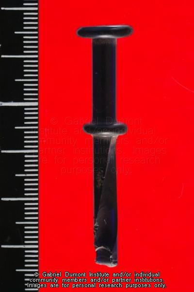 This image (by Peter Beszterda) is of an indigo blue glass bottle stopper. It was collected by Dennis and Jean Fisher and their sons in the late 1960s or early 1970s from Batoche. It is part of the Dennis and Jean Fisher Collection. This collection contains archaeological artifacts taken from the battlefields of the 1885 Resistance as well as Fort Pitt (Saskatchewan), Cumberland House (Saskatchewan) and St. Peter’s Mission, Montana. The collection also includes various artifacts and ephemera relating to the 1885 Resistance and Gabriel Dumont. |