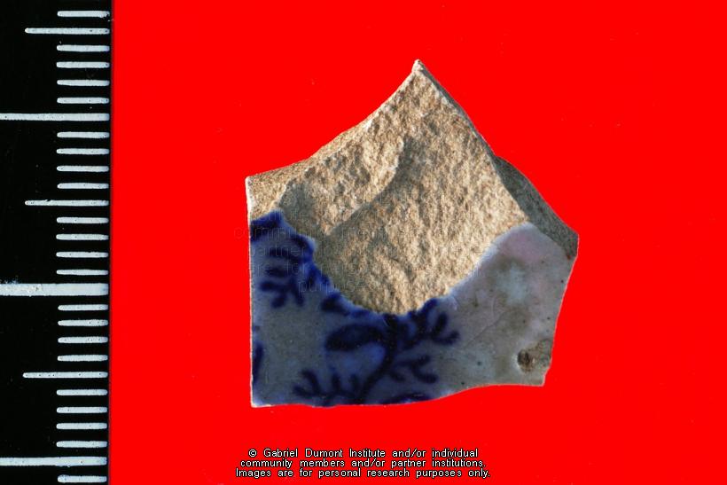 This image (by Peter Beszterda) is of one of three china plate fragments. They were collected by Dennis and Jean Fisher and their sons in the late 1960s or early 1970s from Batoche. They are part of the Dennis and Jean Fisher Collection. This collection contains archaeological artifacts taken from the battlefields of the 1885 Resistance as well as Fort Pitt (Saskatchewan), Cumberland House (Saskatchewan) and St. Peter’s Mission, Montana. The collection also includes various artifacts and ephemera relating to the 1885 Resistance and Gabriel Dumont. |