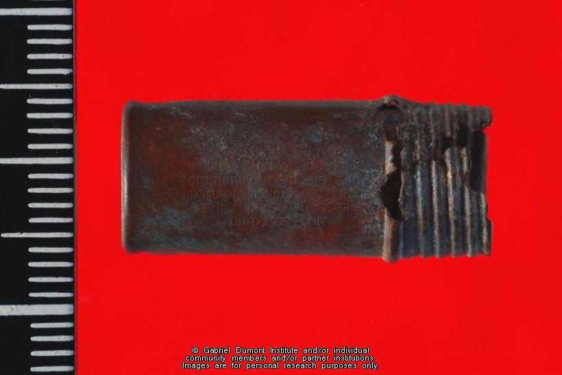 This image (by Peter Beszterda) is of a copper tube from a Thoren's Music Box or Phonograph. It was collected by Dennis and Jean Fisher and their sons in the late 1960s or early 1970s from Batoche. It is part of the Dennis and Jean Fisher Collection. This collection contains archaeological artifacts taken from the battlefields of the 1885 Resistance as well as Fort Pitt (Saskatchewan), Cumberland House (Saskatchewan) and St. Peter’s Mission, Montana. The collection also includes various artifacts and ephemera relating to the 1885 Resistance and Gabriel Dumont. |