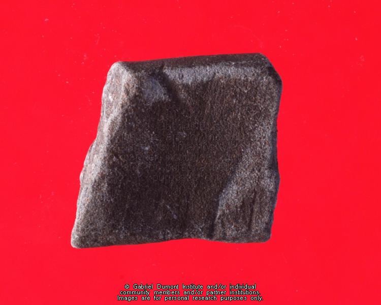 This image (by Peter Beszterda) is of one of five whetstone fragments. They were collected by Dennis and Jean Fisher and their sons in the late 1960s or early 1970s from Batoche. They are part of the Dennis and Jean Fisher Collection. This collection contains archaeological artifacts taken from the battlefields of the 1885 Resistance as well as Fort Pitt (Saskatchewan), Cumberland House (Saskatchewan) and St. Peter’s Mission, Montana. The collection also includes various artifacts and ephemera relating to the 1885 Resistance and Gabriel Dumont. |