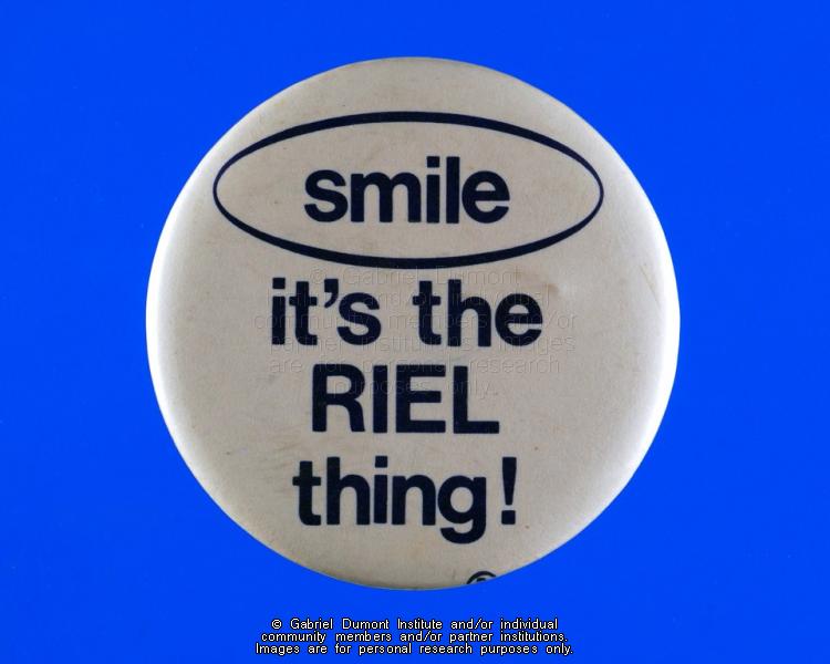 This image (by Peter Beszterda) is of a `` Smile—It’s the Riel Thing!`` button. It is part of the Dennis and Jean Fisher Collection. This collection contains archaeological artifacts taken from the battlefields of the 1885 Resistance as well as Fort Pitt (Saskatchewan), Cumberland House (Saskatchewan) and St. Peter’s Mission, Montana. The collection also includes various artifacts and ephemera relating to the 1885 Resistance and Gabriel Dumont. |