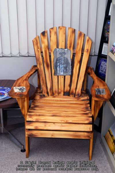 This image is of a Muskoka or Adirondack chair with a historical image of Métis leader, Gabriel Dumont. It was made by a local artisan and were displayed at Batoche National Historic Site before being acquired by the Gabriel Dumont Institute. |