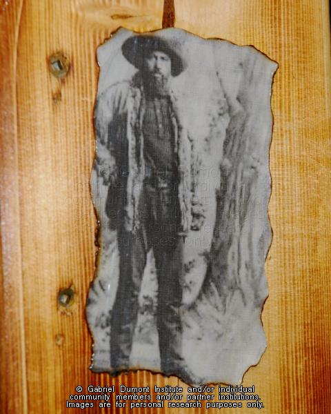 Description: This image is of close-up of a Muskoka or Adirondack chair with a historical image of Métis leader, Gabriel Dumont. It was made by a local artisan and were displayed at Batoche National Historic Site before being acquired by the Gabriel Dumont Institute.