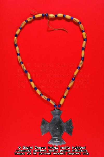 This item is a silver fur trade beaded necklace distributed by the Hudson's Bay Company (HBC) in the late eighteenth or early nineteenth century. The silver part of the necklace (a cross) was made in Montreal and the beads are HBC trade beads. These items were given to Aboriginal chiefs and other dignitaries as a way of ensuring loyalty to the Company. |