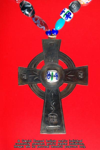 This item is a close-up of a silver fur trade beaded necklace distributed by the Hudson's Bay Company (HBC) in the late eighteenth or early nineteenth century. The silver part of the necklace (a cross) was made in Montreal and the beads are HBC trade beads. These items were given to Aboriginal chiefs and other dignitaries as a way of ensuring loyalty to the Company. This particular necklace belonged to the fur trader Quebec John Kinzie (1763-1828), a Euro-American founder of Chicago.