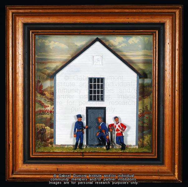 This image (by Peter Beszterda) is of a diorama of the Batoche Church Rectory. It was made by Dennis Fisher and contains painted figures of three North-West Field Force members in front of the rectory. In the background is a reprint of the painting, ``Battle of Batoche,`` which was taken from the ``Canadian Illustrated War News.`` It is part of the Dennis and Jean Fisher Collection. This collection contains archaeological artifacts taken from the battlefields of the 1885 Resistance as well as Fort Pitt (Saskatchewan), Cumberland House (Saskatchewan) and St. Peter’s Mission, Montana. The collection also includes various artifacts and ephemera relating to the 1885 Resistance and Gabriel Dumont. |