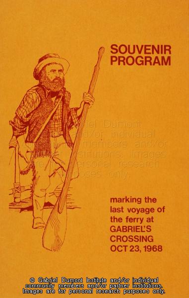 This image (by Peter Beszterda) is of a Gabriel's Crossing Ferry Closing souvenir cover from October 23, 1968. Gabriel's Bridge near Rosthern and Batoche, Saskatchewan was officially opened on this day as well. This pamphlet is part of the Dennis and Jean Fisher Collection. This collection contains archaeological artifacts taken from the battlefields of the 1885 Resistance as well as Fort Pitt (Saskatchewan), Cumberland House (Saskatchewan) and St. Peter's Mission, Montana. The collection also includes various artifacts and ephemera relating to the 1885 Resistance and Gabriel Dumont. |