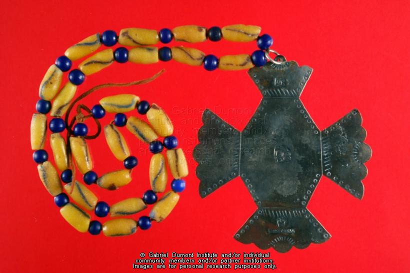 This item is a silver fur trade beaded necklace distributed by the Hudson's Bay Company (HBC) in the late eighteenth or early nineteenth century. The silver part of the necklace (a cross) was made in Montreal and the beads are HBC trade beads. These items were given to Aboriginal chiefs and other dignitaries as a way of ensuring loyalty to the Company. |