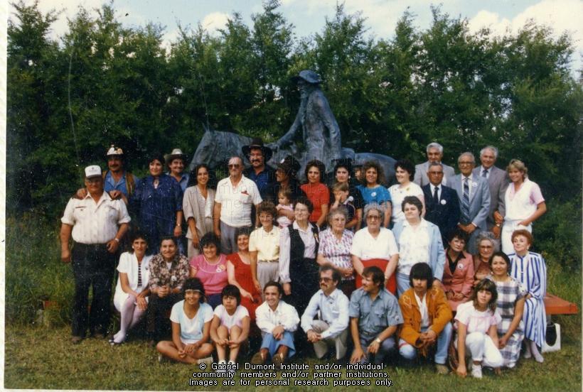 | Description: | This image was taken at the Dumont family reunion held at Duck Lake in 1985. Dumont family members are appearing before a statue of Gabriel Dumont by sculptor Bill Epp. Bill Epp and Dennis Fisher took the statue to the family reunion before the statue was put in its final resting place in Friendship Park in Saskatoon.