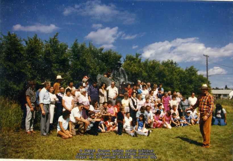 | Description: | This image was taken at the Dumont family reunion held at Duck Lake in 1985. Dumont family members are appearing before a statue of Gabriel Dumont by sculptor Bill Epp. Bill Epp and Dennis Fisher took the statue to the family reunion before the statue was put in its final resting place in Friendship Park in Saskatoon.