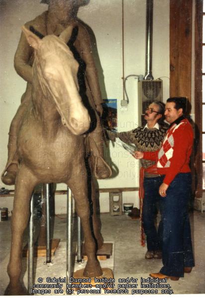 | Description: | In 1984, Saskatoon-based sculptor Bill Epp (brown sweater, pony tail) was commissioned by the Commemorate `85 corporation to sculpt a statue of Gabriel Dumont. In these photographs, Bill Epp (grey sweater) is working on the Gabriel Dumont statue in his workshop in February 1985. Still in plaster, the statue was awaiting casting in bronze at a nearby foundry. The statue was taken to Saskatoon from New Mexico to be unveiled during a special tribute to Gabriel Dumont on May 6, 1985. Later, the statue was taken to the Dumont family reunion at Duck Lake, and was later presented to Saskatoon City Hall on May 14, 1985.