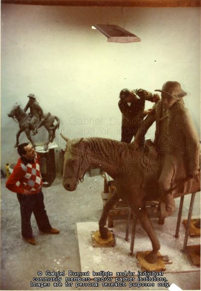 | Description: | In 1984, Saskatoon-based sculptor Bill Epp (brown sweater, pony tail) was commissioned by the Commemorate `85 corporation to sculpt a statue of Gabriel Dumont. In these photographs, Bill Epp (grey sweater) is working on the Gabriel Dumont statue in his workshop in February 1985. Still in plaster, the statue was awaiting casting in bronze at a nearby foundry. The statue was taken to Saskatoon from New Mexico to be unveiled during a special tribute to Gabriel Dumont on May 6, 1985. Later, the statue was taken to the Dumont family reunion at Duck Lake, and was later presented to Saskatoon City Hall on May 14, 1985.