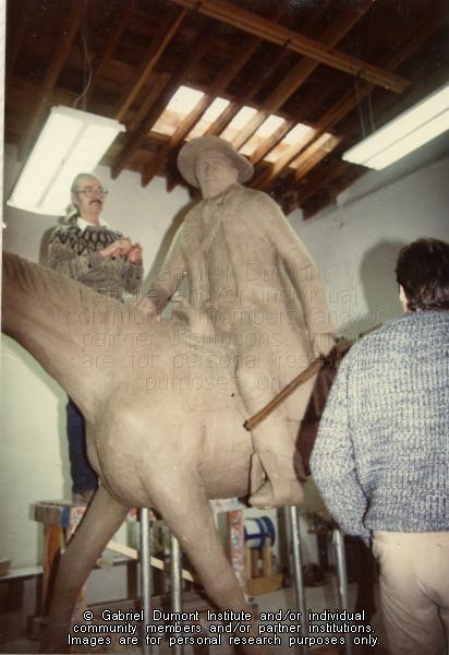 | Description: | In 1984, Saskatoon-based sculptor Bill Epp (brown sweater, pony tail) was commissioned by the Commemorate `85 corporation to sculpt a statue of Gabriel Dumont. In these photographs, Bill Epp (grey sweater) is working on the Gabriel Dumont statue in his workshop in February 1985. Still in plaster, the statue was awaiting casting in bronze at a nearby foundry. The statue was taken to Saskatoon from New Mexico to be unveiled during a special tribute to Gabriel Dumont on May 6, 1985. Later, the statue was taken to the Dumont family reunion at Duck Lake, and was later presented to Saskatoon City Hall on May 14, 1985.