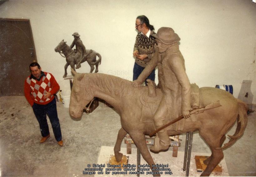 | Description: | In 1984, Saskatoon-based sculptor Bill Epp (brown sweater, pony tail) was commissioned by the Commemorate `85 corporation to sculpt a statue of Gabriel Dumont. In these photographs, Bill Epp (grey sweater) is working on the Gabriel Dumont statue in his workshop in February 1985. Still in plaster, the statue was awaiting casting in bronze at a nearby foundry. The statue was taken to Saskatoon from New Mexico to be unveiled during a special tribute to Gabriel Dumont on May 6, 1985. Later, the statue was taken to the Dumont family reunion at Duck Lake, and was later presented to Saskatoon City Hall on May 14, 1985.
