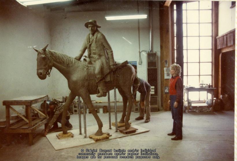 | Description: | In 1984, Saskatoon-based sculptor Bill Epp (brown sweater, pony tail) was commissioned by the Commemorate `85 corporation to sculpt a statue of Gabriel Dumont. In these photographs, Bill Epp (grey sweater) is working on the Gabriel Dumont statue in his workshop in February 1985. Still in plaster, the statue was awaiting casting in bronze at a nearby foundry. The statue was taken to Saskatoon from New Mexico to be unveiled during a special tribute to Gabriel Dumont on May 6, 1985. Later, the statue was taken to the Dumont family reunion at Duck Lake, and was later presented to Saskatoon City Hall on May 14, 1985.