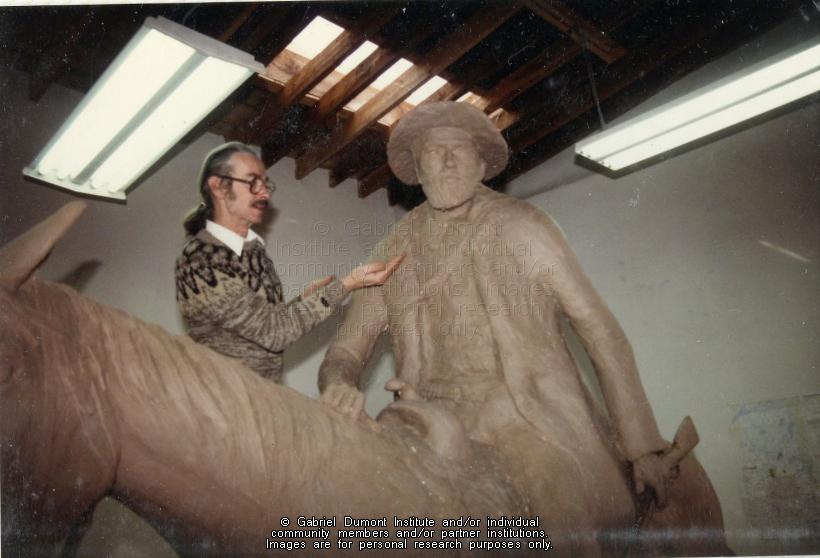 | Description: | In 1984, Saskatoon-based sculptor Bill Epp (brown sweater, pony tail) was commissioned by the Commemorate `85 corporation to sculpt a statue of Gabriel Dumont. In these photographs, Bill Epp (grey sweater) is working on the Gabriel Dumont statue in his workshop in February 1985. Still in plaster, the statue was awaiting casting in bronze at a nearby foundry. The statue was taken to Saskatoon from New Mexico to be unveiled during a special tribute to Gabriel Dumont on May 6, 1985. Later, the statue was taken to the Dumont family reunion at Duck Lake, and was later presented to Saskatoon City Hall on May 14, 1985.