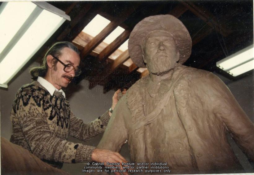 | Description: | In 1984, Saskatoon-based sculptor Bill Epp (brown sweater, pony tail) was commissioned by the Commemorate `85 corporation to sculpt a statue of Gabriel Dumont. In these photographs, Bill Epp (grey sweater) is working on the Gabriel Dumont statue in his workshop in February 1985. Still in plaster, the statue was awaiting casting in bronze at a nearby foundry. The statue was taken to Saskatoon from New Mexico to be unveiled during a special tribute to Gabriel Dumont on May 6, 1985. Later, the statue was taken to the Dumont family reunion at Duck Lake, and was later presented to Saskatoon City Hall on May 14, 1985.