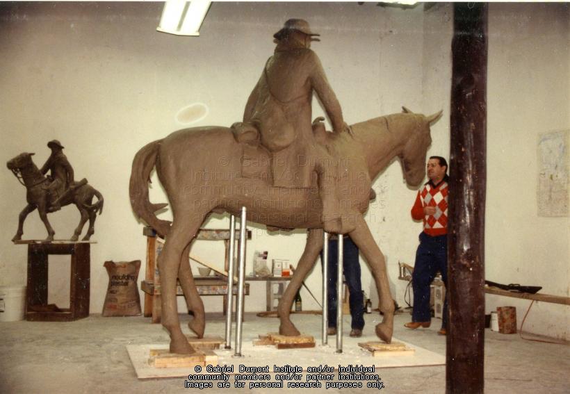 | Description: | In 1984, Saskatoon-based sculptor Bill Epp (brown sweater, pony tail) was commissioned by the Commemorate `85 corporation to sculpt a statue of Gabriel Dumont. In these photographs, Bill Epp (grey sweater) is working on the Gabriel Dumont statue in his workshop in February 1985. Still in plaster, the statue was awaiting casting in bronze at a nearby foundry. The statue was taken to Saskatoon from New Mexico to be unveiled during a special tribute to Gabriel Dumont on May 6, 1985. Later, the statue was taken to the Dumont family reunion at Duck Lake, and was later presented to Saskatoon City Hall on May 14, 1985.