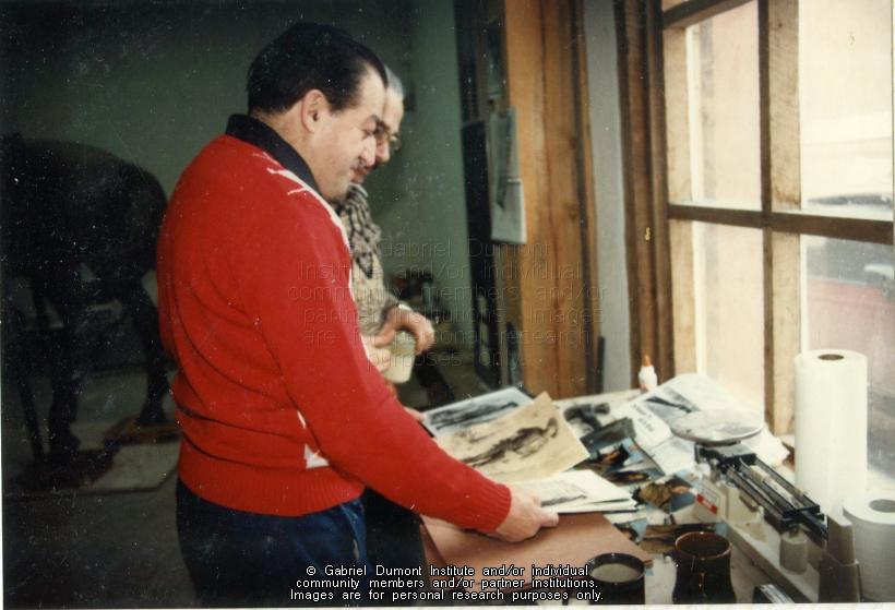| Description: | In 1984, Saskatoon-based sculptor Bill Epp (brown sweater, pony tail) was commissioned by the Commemorate `85 corporation to sculpt a statue of Gabriel Dumont. In these photographs, Bill Epp (grey sweater) is working on the Gabriel Dumont statue in his workshop in February 1985. Still in plaster, the statue was awaiting casting in bronze at a nearby foundry. The statue was taken to Saskatoon from New Mexico to be unveiled during a special tribute to Gabriel Dumont on May 6, 1985. Later, the statue was taken to the Dumont family reunion at Duck Lake, and was later presented to Saskatoon City Hall on May 14, 1985.