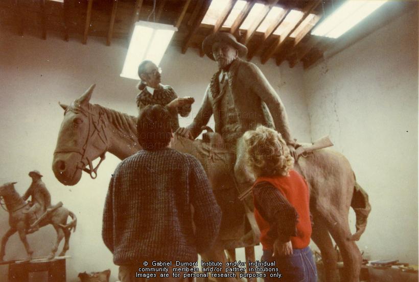 | Description: | In 1984, Saskatoon-based sculptor Bill Epp (brown sweater, pony tail) was commissioned by the Commemorate `85 corporation to sculpt a statue of Gabriel Dumont. In these photographs, Bill Epp (grey sweater) is working on the Gabriel Dumont statue in his workshop in February 1985. Still in plaster, the statue was awaiting casting in bronze at a nearby foundry. The statue was taken to Saskatoon from New Mexico to be unveiled during a special tribute to Gabriel Dumont on May 6, 1985. Later, the statue was taken to the Dumont family reunion at Duck Lake, and was later presented to Saskatoon City Hall on May 14, 1985.