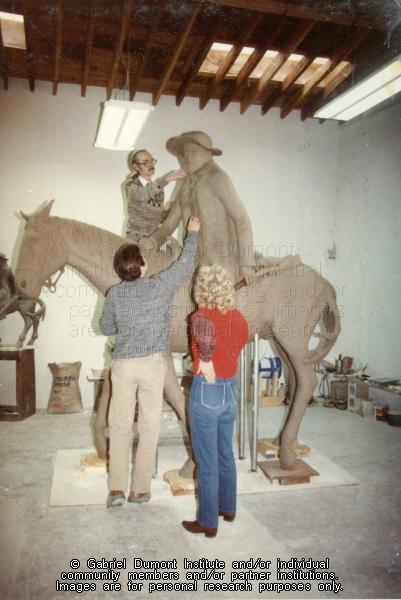 | Description: | In 1984, Saskatoon-based sculptor Bill Epp (brown sweater, pony tail) was commissioned by the Commemorate `85 corporation to sculpt a statue of Gabriel Dumont. In these photographs, Bill Epp (grey sweater) is working on the Gabriel Dumont statue in his workshop in February 1985. Still in plaster, the statue was awaiting casting in bronze at a nearby foundry. The statue was taken to Saskatoon from New Mexico to be unveiled during a special tribute to Gabriel Dumont on May 6, 1985. Later, the statue was taken to the Dumont family reunion at Duck Lake, and was later presented to Saskatoon City Hall on May 14, 1985.