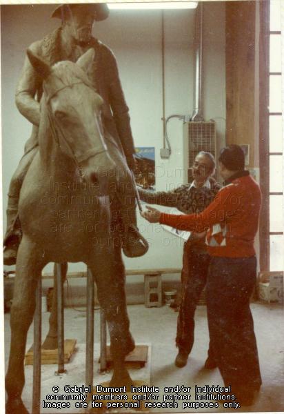 | Description: | In 1984, Saskatoon-based sculptor Bill Epp (brown sweater, pony tail) was commissioned by the Commemorate `85 corporation to sculpt a statue of Gabriel Dumont. In these photographs, Bill Epp (grey sweater) is working on the Gabriel Dumont statue in his workshop in February 1985. Still in plaster, the statue was awaiting casting in bronze at a nearby foundry. The statue was taken to Saskatoon from New Mexico to be unveiled during a special tribute to Gabriel Dumont on May 6, 1985. Later, the statue was taken to the Dumont family reunion at Duck Lake, and was later presented to Saskatoon City Hall on May 14, 1985.