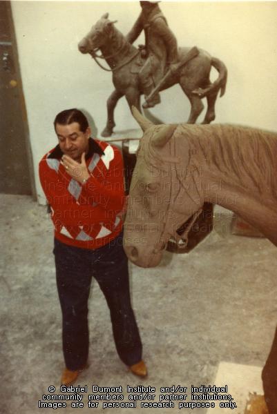 | Description: | In 1984, Saskatoon-based sculptor Bill Epp (brown sweater, pony tail) was commissioned by the Commemorate `85 corporation to sculpt a statue of Gabriel Dumont. In these photographs, Bill Epp (grey sweater) is working on the Gabriel Dumont statue in his workshop in February 1985. Still in plaster, the statue was awaiting casting in bronze at a nearby foundry. The statue was taken to Saskatoon from New Mexico to be unveiled during a special tribute to Gabriel Dumont on May 6, 1985. Later, the statue was taken to the Dumont family reunion at Duck Lake, and was later presented to Saskatoon City Hall on May 14, 1985.