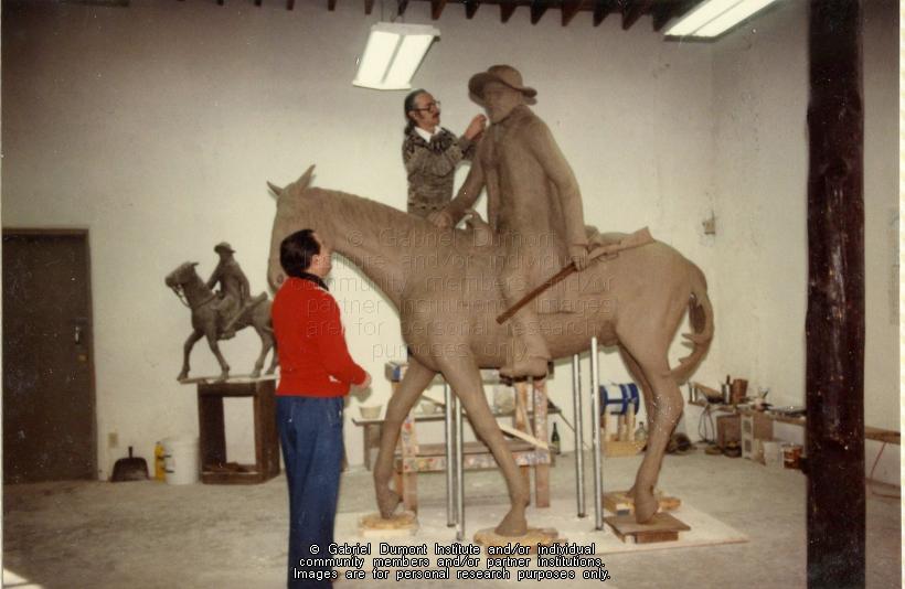 | Description: | In 1984, Saskatoon-based sculptor Bill Epp (brown sweater, pony tail) was commissioned by the Commemorate `85 corporation to sculpt a statue of Gabriel Dumont. In these photographs, Bill Epp (grey sweater) is working on the Gabriel Dumont statue in his workshop in February 1985. Still in plaster, the statue was awaiting casting in bronze at a nearby foundry. The statue was taken to Saskatoon from New Mexico to be unveiled during a special tribute to Gabriel Dumont on May 6, 1985. Later, the statue was taken to the Dumont family reunion at Duck Lake, and was later presented to Saskatoon City Hall on May 14, 1985.