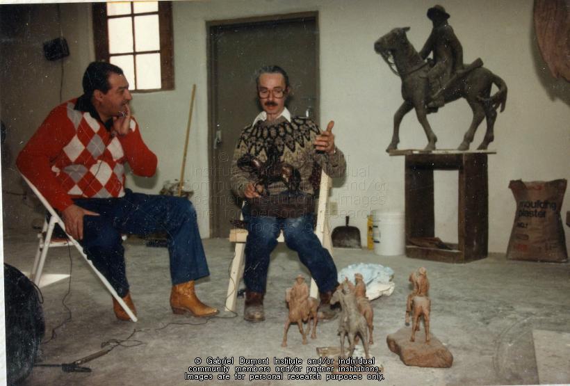 | Description: | In 1984, Saskatoon-based sculptor Bill Epp (brown sweater, pony tail) was commissioned by the Commemorate `85 corporation to sculpt a statue of Gabriel Dumont. In these photographs, Bill Epp (grey sweater) is working on the Gabriel Dumont statue in his workshop in February 1985. Still in plaster, the statue was awaiting casting in bronze at a nearby foundry. The statue was taken to Saskatoon from New Mexico to be unveiled during a special tribute to Gabriel Dumont on May 6, 1985. Later, the statue was taken to the Dumont family reunion at Duck Lake, and was later presented to Saskatoon City Hall on May 14, 1985.