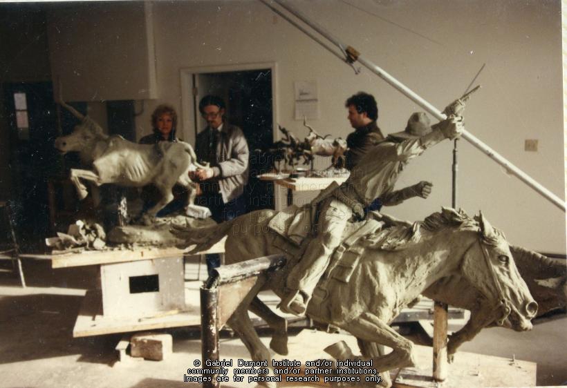 | Description: | In 1984, Saskatoon-based sculptor Bill Epp (brown sweater, pony tail) was commissioned by the Commemorate `85 corporation to sculpt a statue of Gabriel Dumont. In these photographs, Bill Epp (grey sweater) is working on the Gabriel Dumont statue in his workshop in February 1985. Still in plaster, the statue was awaiting casting in bronze at a nearby foundry. The statue was taken to Saskatoon from New Mexico to be unveiled during a special tribute to Gabriel Dumont on May 6, 1985. Later, the statue was taken to the Dumont family reunion at Duck Lake, and was later presented to Saskatoon City Hall on May 14, 1985.
