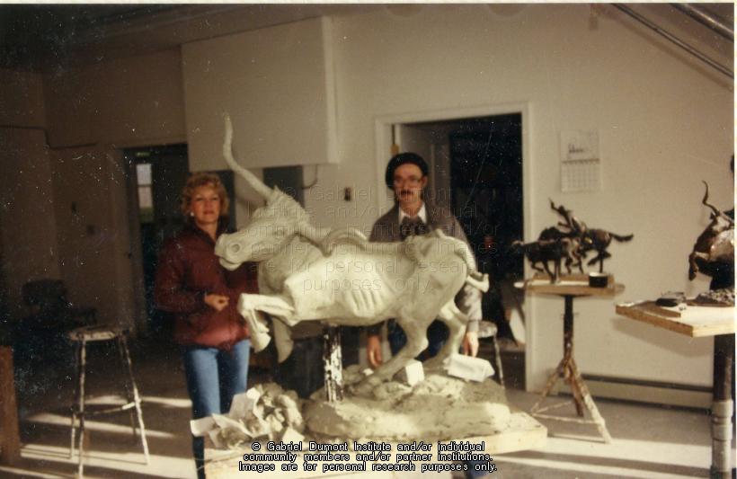 | Description: | In 1984, Saskatoon-based sculptor Bill Epp (brown sweater, pony tail) was commissioned by the Commemorate `85 corporation to sculpt a statue of Gabriel Dumont. In these photographs, Bill Epp (grey sweater) is working on the Gabriel Dumont statue in his workshop in February 1985. Still in plaster, the statue was awaiting casting in bronze at a nearby foundry. The statue was taken to Saskatoon from New Mexico to be unveiled during a special tribute to Gabriel Dumont on May 6, 1985. Later, the statue was taken to the Dumont family reunion at Duck Lake, and was later presented to Saskatoon City Hall on May 14, 1985.