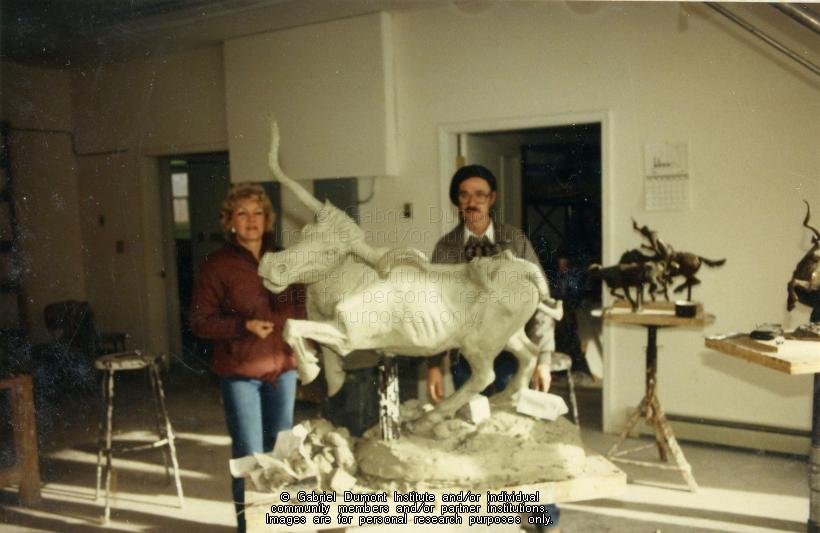| Description: | In 1984, Saskatoon-based sculptor Bill Epp (brown sweater, pony tail) was commissioned by the Commemorate `85 corporation to sculpt a statue of Gabriel Dumont. In these photographs, Bill Epp (grey sweater) is working on the Gabriel Dumont statue in his workshop in February 1985. Still in plaster, the statue was awaiting casting in bronze at a nearby foundry. The statue was taken to Saskatoon from New Mexico to be unveiled during a special tribute to Gabriel Dumont on May 6, 1985. Later, the statue was taken to the Dumont family reunion at Duck Lake, and was later presented to Saskatoon City Hall on May 14, 1985.