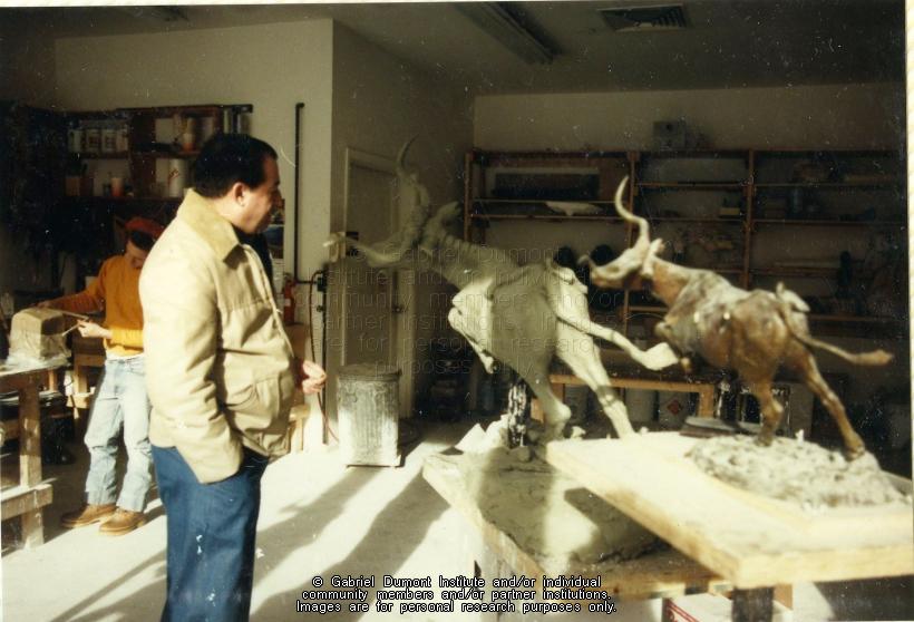 | Description: | In 1984, Saskatoon-based sculptor Bill Epp (brown sweater, pony tail) was commissioned by the Commemorate `85 corporation to sculpt a statue of Gabriel Dumont. In these photographs, Bill Epp (grey sweater) is working on the Gabriel Dumont statue in his workshop in February 1985. Still in plaster, the statue was awaiting casting in bronze at a nearby foundry. The statue was taken to Saskatoon from New Mexico to be unveiled during a special tribute to Gabriel Dumont on May 6, 1985. Later, the statue was taken to the Dumont family reunion at Duck Lake, and was later presented to Saskatoon City Hall on May 14, 1985.