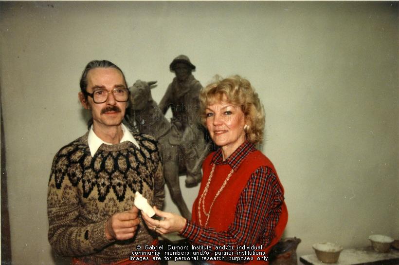 Dennis (red sweater; brown coat) and Jean Fisher (red sweater) appear in many of these photographs. The final maquette from which the statue would be based also appears in some of these photographs. The maquette`s measurements were 109 cm to the top of the hat, 94 cm to the top of the ear, 102 cm in overall all length, and 33 cm at its greatest width. It weighted approximately 200 lbs (90.72 kg), and its estimated casting cost was $5,000 US. Dennis Fisher, then chair of the Commemorate `85 Corporation and a long-time collector of Métis and First Nations artifacts, was the driving force behind the creation of this statue. Bill Epp originally wanted to make a statue of Louis Riel but Dennis Fisher convinced him to make one of Gabriel Dumont. This folder contains images relating to the commemoration of Gabriel Dumont during the centenary of the 1885 Resistance. This album (#12 in Dennis Fisher`s Photo Collection) centres around sculptor Bill Epp making the Gabriel Dumont statute in his studio in New Mexico; Dennis and Jean Fisher visiting Epp in his studio; the Fishers and Epp taking the statue to the Dumont family reunion in the summer of 1885; the Fishers and Epp taking the statue to Saskatoon for public display; and having it unveiled on a day of tribute to Gabriel Dumont on May 6, 1985 in Saskatoon. Other events including the unveiling of the Gabriel Dumont stamp and first-day cover by Canada Post, the dedication of the Gabriel Dumont Statue and Park, jigging and square dancing by the Gabriel Dumont Dancers, and the official opening of the Marr Residence. The Gabriel Dumont Statue was originally to be placed in the newly-created Gabriel Dumont Park; however, it permanently rests in Friendship Park in Saskatoon. This photo album is part of the Dennis and Jean Fisher Collection. This collection contains archaeological artifacts taken from the battlefields of the 1885 Resistance as well as Fort Pitt (Saskatchewan), Cumberland House (Saskatchewan), and St. Peter`s Mission, Montana. The collection also includes various artifacts and ephemera relating to the 1885 Resistance and Gabriel Dumont. |