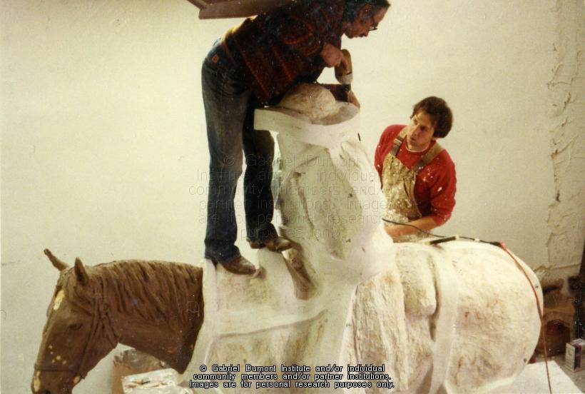 | Description: | In 1984, Saskatoon-based sculptor Bill Epp (brown sweater, pony tail) was commissioned by the Commemorate `85 corporation to sculpt a statue of Gabriel Dumont. In these photographs, Bill Epp (grey sweater) is working on the Gabriel Dumont statue in his workshop in February 1985. Still in plaster, the statue was awaiting casting in bronze at a nearby foundry. The statue was taken to Saskatoon from New Mexico to be unveiled during a special tribute to Gabriel Dumont on May 6, 1985. Later, the statue was taken to the Dumont family reunion at Duck Lake, and was later presented to Saskatoon City Hall on May 14, 1985.
