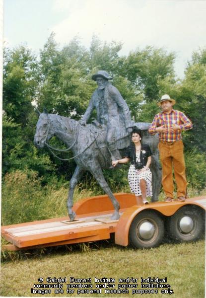 This folder contains images relating to the commemoration of Gabriel Dumont during the centenary of the 1885 Resistance. This album (#12 in Dennis Fisher`s Photo Collection) centres around sculptor Bill Epp making the Gabriel Dumont statute in his studio in New Mexico; Dennis and Jean Fisher visiting Epp in his studio; the Fishers and Epp taking the statue to the Dumont family reunion in the summer of 1885; the Fishers and Epp taking the statue to Saskatoon for public display; and having it unveiled on a day of tribute to Gabriel Dumont on May 6, 1985 in Saskatoon. Other events including the unveiling of the Gabriel Dumont stamp and first-day cover by Canada Post, the dedication of the Gabriel Dumont Statue and Park, jigging and square dancing by the Gabriel Dumont Dancers, and the official opening of the Marr Residence. The Gabriel Dumont Statue was originally to be placed in the newly-created Gabriel Dumont Park; however, it permanently rests in Friendship Park in Saskatoon. This photo album is part of the Dennis and Jean Fisher Collection. This collection contains archaeological artifacts taken from the battlefields of the 1885 Resistance as well as Fort Pitt (Saskatchewan), Cumberland House (Saskatchewan), and St. Peter`s Mission, Montana. The collection also includes various artifacts and ephemera relating to the 1885 Resistance and Gabriel Dumont. |