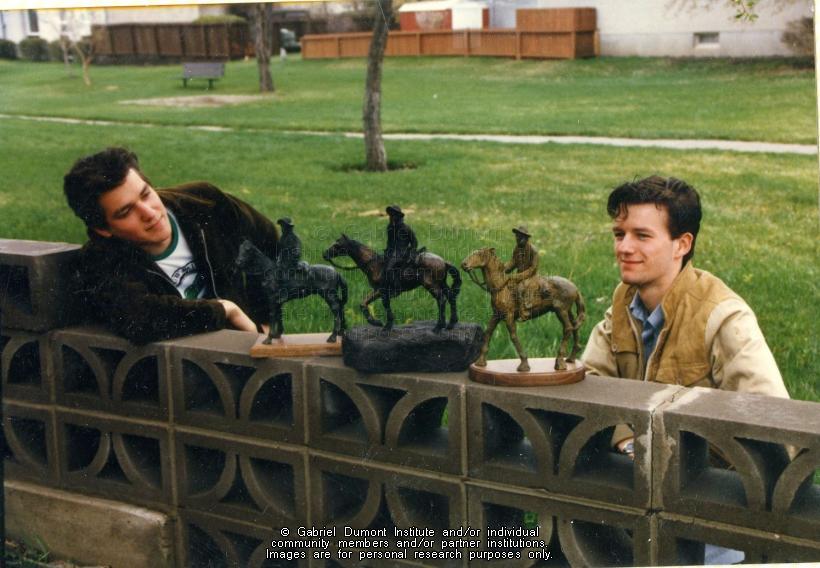 | Description: | This image is of David and Darwin Fisher looking at three Gabriel Dumont maquettes, which were used to determine the final look of Bill Epp`s statue. This folder contains images relating to the commemoration of Gabriel Dumont during the centenary of the 1885 Resistance. This album (#12 in Dennis Fisher`s Photo Collection) centres around sculptor Bill Epp making the Gabriel Dumont statute in his studio in New Mexico; Dennis and Jean Fisher visiting Epp in his studio; the Fishers and Epp taking the statue to the Dumont family reunion in the summer of 1885; the Fishers and Epp taking the statue to Saskatoon for public display; and having it unveiled on a day of tribute to Gabriel Dumont on May 6, 1985 in Saskatoon. Other events including the unveiling of the Gabriel Dumont stamp and first-day cover by Canada Post, the dedication of the Gabriel Dumont Statue and Park, jigging and square dancing by the Gabriel Dumont Dancers, and the official opening of the Marr Residence. The Gabriel Dumont Statue was originally to be placed in the newly-created Gabriel Dumont Park; however, it permanently rests in Friendship Park in Saskatoon.