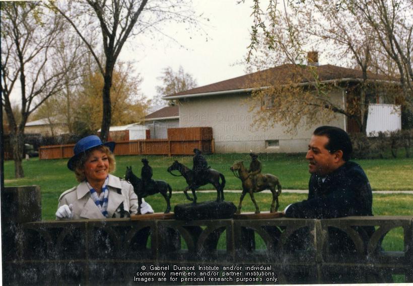 | Description: | This image is of Jean and Dennis Fisher looking at three Gabriel Dumont maquettes, which were used to determine the final look of Bill Epp`s statue. This folder contains images relating to the commemoration of Gabriel Dumont during the centenary of the 1885 Resistance. This album (#12 in Dennis Fisher`s Photo Collection) centres around sculptor Bill Epp making the Gabriel Dumont statute in his studio in New Mexico; Dennis and Jean Fisher visiting Epp in his studio; the Fishers and Epp taking the statue to the Dumont family reunion in the summer of 1885; the Fishers and Epp taking the statue to Saskatoon for public display; and having it unveiled on a day of tribute to Gabriel Dumont on May 6, 1985 in Saskatoon. Other events including the unveiling of the Gabriel Dumont stamp and first-day cover by Canada Post, the dedication of the Gabriel Dumont Statue and Park, jigging and square dancing by the Gabriel Dumont Dancers, and the official opening of the Marr Residence. The Gabriel Dumont Statue was originally to be placed in the newly-created Gabriel Dumont Park; however, it permanently rests in Friendship Park in Saskatoon.