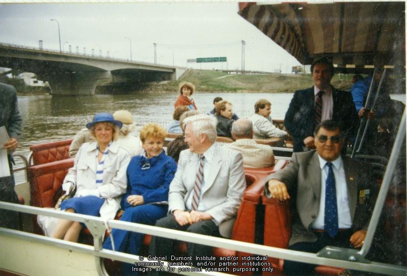 | Description: | In this image, special guests are travelling by boat to attend a ceremony honouring Gabriel Dumont. On May 6, 1985, there was a ceremony to honour Gabriel Dumont in Saskatoon. Events included the unveiling of the Gabriel Dumont stamp and first-day cover by Canada Post, the dedication of the Gabriel Dumont Statue and Park, jigging and square dancing by the Gabriel Dumont Dancers, and the official opening of the Marr Residence. This folder contains images relating to the commemoration of Gabriel Dumont during the centenary of the 1885 Resistance. This album (#12 in Dennis Fisher`s Photo Collection) centres around sculptor Bill Epp making the Gabriel Dumont statute in his studio in New Mexico; Dennis and Jean Fisher visiting Epp in his studio; the Fishers and Epp taking the statue to the Dumont family reunion in the summer of 1885; the Fishers and Epp taking the statue to Saskatoon for public display; and having it unveiled on a day of tribute to Gabriel Dumont on May 6, 1985 in Saskatoon.The Gabriel Dumont Statue was originally to be placed in the newly-created Gabriel Dumont Park; however, it permanently rests in Friendship Park in Saskatoon.