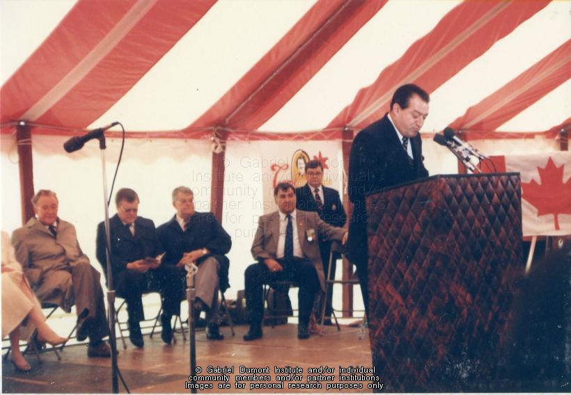 | Description: | In this image, Dennis Fisher is speaking in front of honoured guests at the ceremony honouring Gabriel Dumont. On May 6, 1985, there was a ceremony to honour Gabriel Dumont in Saskatoon. Events included the unveiling of the Gabriel Dumont stamp and first-day cover by Canada Post, the dedication of the Gabriel Dumont Statue and Park, jigging and square dancing by the Gabriel Dumont Dancers, and the official opening of the Marr Residence. This folder contains images relating to the commemoration of Gabriel Dumont during the centenary of the 1885 Resistance. This album (#12 in Dennis Fisher`s Photo Collection) centres around sculptor Bill Epp making the Gabriel Dumont statute in his studio in New Mexico; Dennis and Jean Fisher visiting Epp in his studio; the Fishers and Epp taking the statue to the Dumont family reunion in the summer of 1885; the Fishers and Epp taking the statue to Saskatoon for public display; and having it unveiled on a day of tribute to Gabriel Dumont on May 6, 1985 in Saskatoon.The Gabriel Dumont Statue was originally to be placed in the newly-created Gabriel Dumont Park; however, it permanently rests in Friendship Park in Saskatoon.