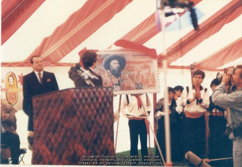 | Description: | In this image, Dennis Fisher watches as a Canada Post employee unveils a larger facsimile version of the new Gabriel Dumont stamp at the ceremony honouring Gabriel Dumont. On May 6, 1985, there was a ceremony to honour Gabriel Dumont in Saskatoon. Events included the unveiling of the Gabriel Dumont stamp and first-day cover by Canada Post, the dedication of the Gabriel Dumont Statue and Park, jigging and square dancing by the Gabriel Dumont Dancers, and the official opening of the Marr Residence. This folder contains images relating to the commemoration of Gabriel Dumont during the centenary of the 1885 Resistance. This album (#12 in Dennis Fisher`s Photo Collection) centres around sculptor Bill Epp making the Gabriel Dumont statute in his studio in New Mexico; Dennis and Jean Fisher visiting Epp in his studio; the Fishers and Epp taking the statue to the Dumont family reunion in the summer of 1885; the Fishers and Epp taking the statue to Saskatoon for public display; and having it unveiled on a day of tribute to Gabriel Dumont on May 6, 1985 in Saskatoon.The Gabriel Dumont Statue was originally to be placed in the newly-created Gabriel Dumont Park; however, it permanently rests in Friendship Park in Saskatoon.