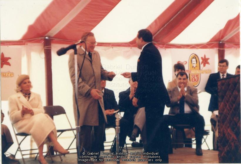 | Description: | In this image, Dennis Fisher shakes hands with then Saskatoon mayor Cliff Wright in front of honoured guests at the ceremony honouring Gabriel Dumont. On May 6, 1985, there was a ceremony to honour Gabriel Dumont in Saskatoon. Events included the unveiling of the Gabriel Dumont stamp and first-day cover by Canada Post, the dedication of the Gabriel Dumont Statue and Park, jigging and square dancing by the Gabriel Dumont Dancers, and the official opening of the Marr Residence. This folder contains images relating to the commemoration of Gabriel Dumont during the centenary of the 1885 Resistance. This album (#12 in Dennis Fisher`s Photo Collection) centres around sculptor Bill Epp making the Gabriel Dumont statute in his studio in New Mexico; Dennis and Jean Fisher visiting Epp in his studio; the Fishers and Epp taking the statue to the Dumont family reunion in the summer of 1885; the Fishers and Epp taking the statue to Saskatoon for public display; and having it unveiled on a day of tribute to Gabriel Dumont on May 6, 1985 in Saskatoon.The Gabriel Dumont Statue was originally to be placed in the newly-created Gabriel Dumont Park; however, it permanently rests in Friendship Park in Saskatoon.