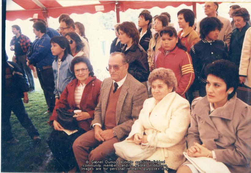| Description: | In this image, members of Gabriel Dumont`s extended family, including Estelle Ellis, far right, are sitting down at the ceremony honouring Gabriel Dumont. On May 6, 1985, there was a ceremony to honour Gabriel Dumont in Saskatoon. Events included the unveiling of the Gabriel Dumont stamp and first-day cover by Canada Post, the dedication of the Gabriel Dumont Statue and Park, jigging and square dancing by the Gabriel Dumont Dancers, and the official opening of the Marr Residence. This folder contains images relating to the commemoration of Gabriel Dumont during the centenary of the 1885 Resistance. This album (#12 in Dennis Fisher`s Photo Collection) centres around sculptor Bill Epp making the Gabriel Dumont statute in his studio in New Mexico; Dennis and Jean Fisher visiting Epp in his studio; the Fishers and Epp taking the statue to the Dumont family reunion in the summer of 1885; the Fishers and Epp taking the statue to Saskatoon for public display; and having it unveiled on a day of tribute to Gabriel Dumont on May 6, 1985 in Saskatoon.The Gabriel Dumont Statue was originally to be placed in the newly-created Gabriel Dumont Park; however, it permanently rests in Friendship Park in Saskatoon.
