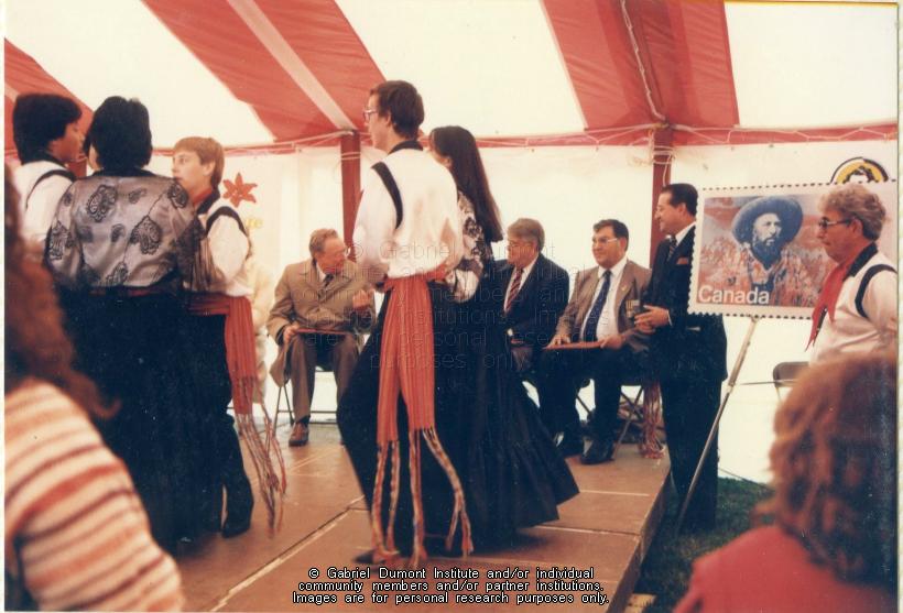 In this image, the Gabriel Dumont Dancers are jigging at the ceremony honouring Gabriel Dumont. On May 6, 1985, there was a ceremony to honour Gabriel Dumont in Saskatoon. Events included the unveiling of the Gabriel Dumont stamp and first-day cover by Canada Post, the dedication of the Gabriel Dumont Statue and Park, jigging and square dancing by the Gabriel Dumont Dancers, and the official opening of the Marr Residence. This folder contains images relating to the commemoration of Gabriel Dumont during the centenary of the 1885 Resistance. This album (#12 in Dennis Fisher`s Photo Collection) centres around sculptor Bill Epp making the Gabriel Dumont statute in his studio in New Mexico; Dennis and Jean Fisher visiting Epp in his studio; the Fishers and Epp taking the statue to the Dumont family reunion in the summer of 1885; the Fishers and Epp taking the statue to Saskatoon for public display; and having it unveiled on a day of tribute to Gabriel Dumont on May 6, 1985 in Saskatoon. The Gabriel Dumont Statue was originally to be placed in the newly-created Gabriel Dumont Park; however, it permanently rests in Friendship Park in Saskatoon. |