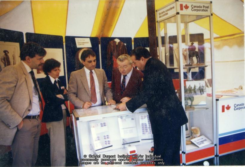 | Description: | In this image, Dennis Fisher and others are looking at an item at the Canada Post booth at the ceremony honouring Gabriel Dumont. On May 6, 1985, there was a ceremony to honour Gabriel Dumont in Saskatoon. Events included the unveiling of the Gabriel Dumont stamp and first-day cover by Canada Post, the dedication of the Gabriel Dumont Statue and Park, jigging and square dancing by the Gabriel Dumont Dancers, and the official opening of the Marr Residence. This folder contains images relating to the commemoration of Gabriel Dumont during the centenary of the 1885 Resistance. This album (#12 in Dennis Fisher`s Photo Collection) centres around sculptor Bill Epp making the Gabriel Dumont statute in his studio in New Mexico; Dennis and Jean Fisher visiting Epp in his studio; the Fishers and Epp taking the statue to the Dumont family reunion in the summer of 1885; the Fishers and Epp taking the statue to Saskatoon for public display; and having it unveiled on a day of tribute to Gabriel Dumont on May 6, 1985 in Saskatoon. The Gabriel Dumont Statue was originally to be placed in the newly-created Gabriel Dumont Park; however, it permanently rests in Friendship Park in Saskatoon.