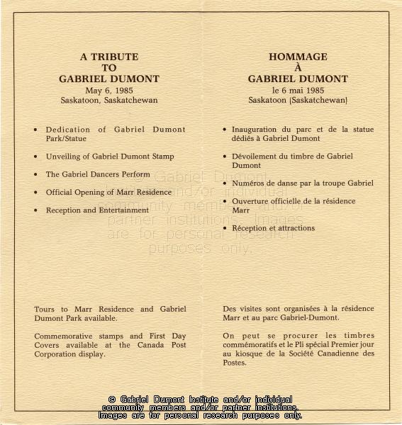 | Description: | This image consists of the inside pages of the the pamphlet that was handed out to the public during the ceremony honouring Gabriel Dumont. On May 6, 1985, there was a ceremony to honour Gabriel Dumont in Saskatoon. Events included the unveiling of the Gabriel Dumont stamp and first-day cover by Canada Post, the dedication of the Gabriel Dumont Statue and Park, jigging and square dancing by the Gabriel Dumont Dancers, and the official opening of the Marr Residence. This folder contains images relating to the commemoration of Gabriel Dumont during the centenary of the 1885 Resistance. This album (#12 in Dennis Fisher`s Photo Collection) centres around sculptor Bill Epp making the Gabriel Dumont statute in his studio in New Mexico; Dennis and Jean Fisher visiting Epp in his studio; the Fishers and Epp taking the statue to the Dumont family reunion in the summer of 1885; the Fishers and Epp taking the statue to Saskatoon for public display; and having it unveiled on a day of tribute to Gabriel Dumont on May 6, 1985 in Saskatoon. The Gabriel Dumont Statue was originally to be placed in the newly-created Gabriel Dumont Park; however, it permanently rests in Friendship Park in Saskatoon.